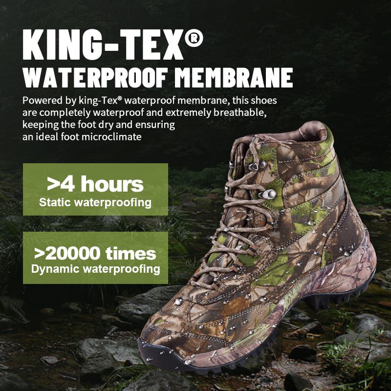 Giày đi săn có màng chống nước Kingtex giữ cho bàn chân của bạn khô ráo qua đầm lầy và bùn, trong khi thiết kế thân thiện với tàng hình giúp bạn biến mất trong cảnh quan. Không có tiếng ồn. Không có phiền nhiễu. Chỉ có bạn và cuộc đi săn. Hãy gửi yêu cầu cho chúng tôi để biết thêm thông tin.