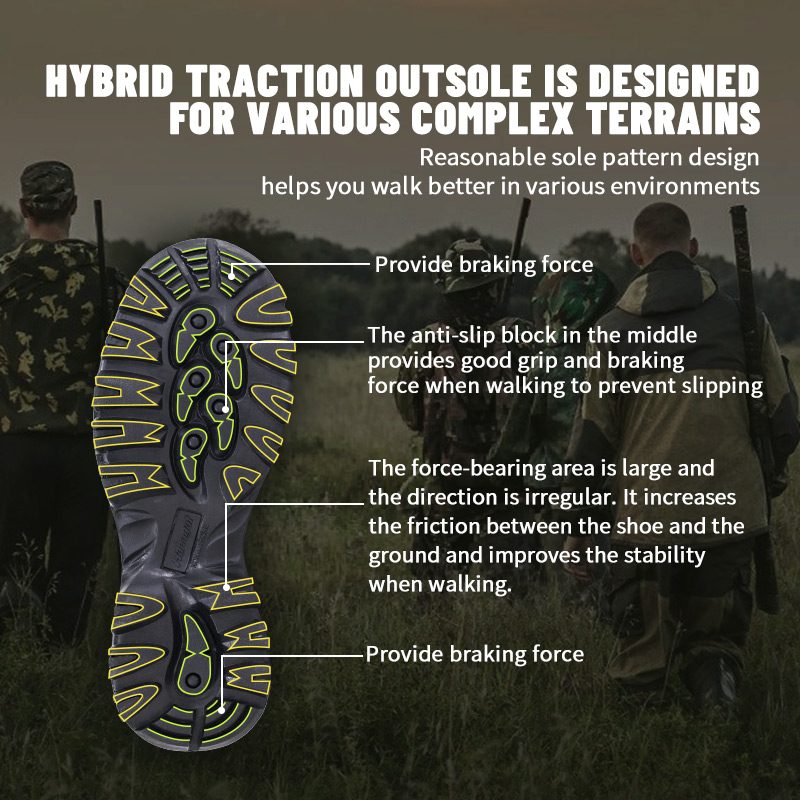 ①Đế thấm hút ẩm có độ co giãn cao Poliyou giữ cho bên trong luôn khô ráo. ②Đế giữa EVA, được bọc bằng vải ngụy trang, đệm và hấp thụ sốc. ③Đế ngoài bằng cao su bền, chống trơn trượt và chống mài mòn.