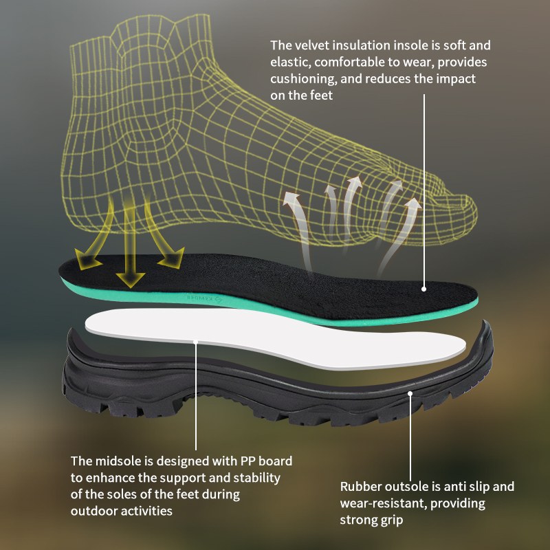①Lớp lót nhung. Dưới chân mềm mại. Hấp thụ tác động. ②Đế giữa bằng PP để hỗ trợ ổn định. ③Đế ngoài bằng cao su không bị tuột. Độ bám, kéo dài, vẫn đáng tin cậy.