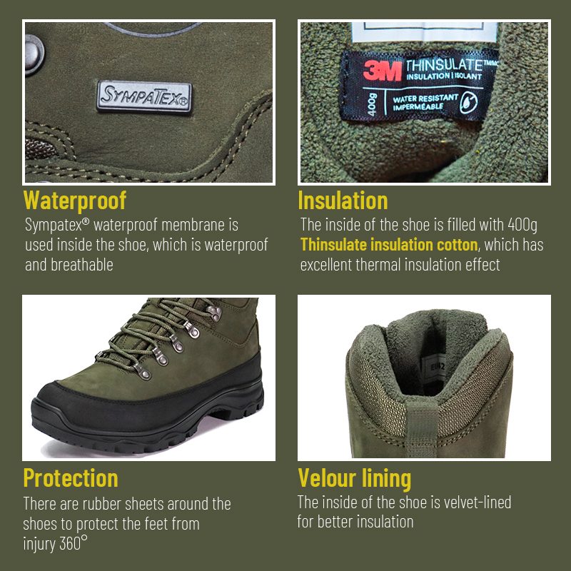 Những đôi ủng đi săn cách nhiệt chống nước Sympatex này có sẵn để tùy chỉnh về màu sắc, chất liệu và chi tiết, với MOQ là 800 đôi, lý tưởng cho việc hợp tác thương hiệu và mua sắm theo nhóm. Và những đôi ủng đi săn này có những ưu điểm sau: