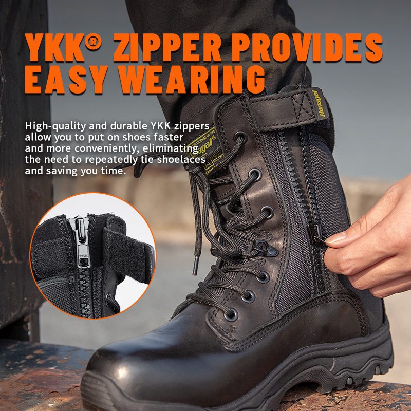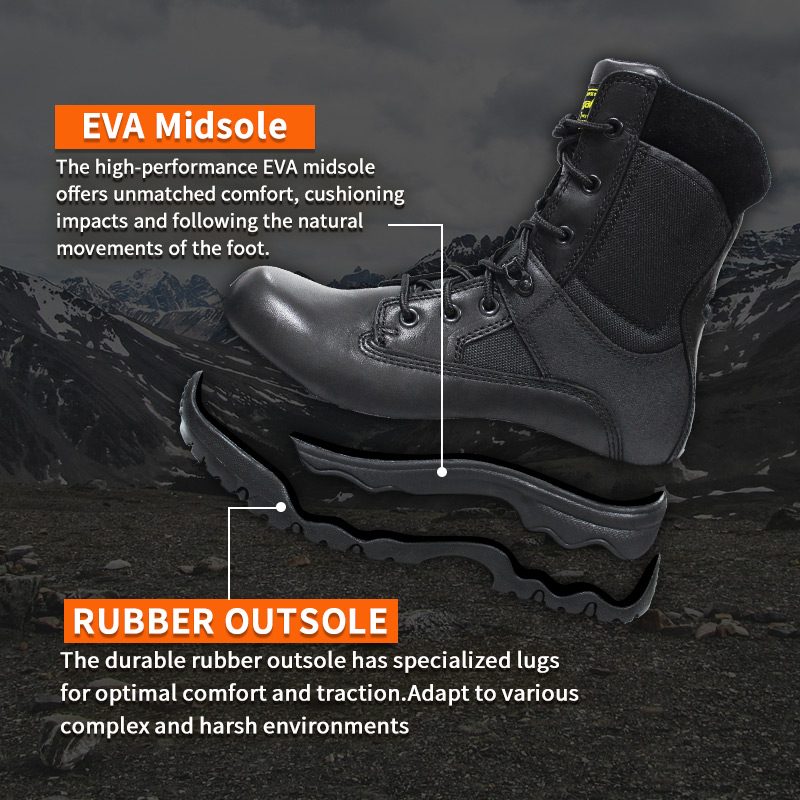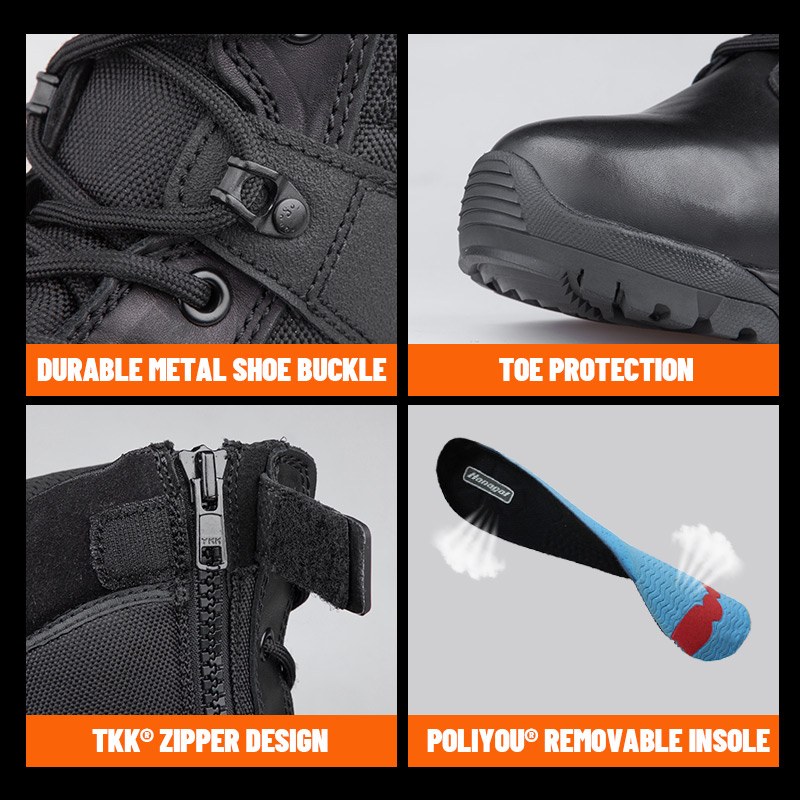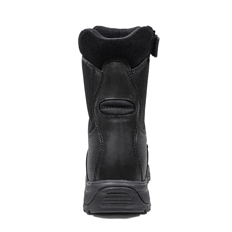 Giày cảnh sát bằng da nguyên hạt có dây kéo YKK được chế tạo để mang lại tốc độ và tính cơ động—mà không ảnh hưởng đến khả năng hỗ trợ hoặc độ bền khi địa hình trở nên khó khăn. Phần trên kết hợp da nguyên hạt không thấm nước với vải công nghệ chống mài mòn, thoáng khí. Khóa kéo YKK giúp bật/tắt nhanh chóng và dễ dàng. Thiết kế cắt cao bao bọc phía trên mắt cá chân để tăng cường bảo vệ và ổn định. Dưới chân, đế giữa EVA hiệu suất cao mang lại khả năng giảm chấn hiệu quả, hấp thụ lực tác động đồng thời giúp chân bạn di chuyển tự nhiên. Và đế ngoài cao su? Các vấu sâu, chuyên dụng mang lại cho bạn độ bám mà bạn cần — hết dặm này đến dặm khác.